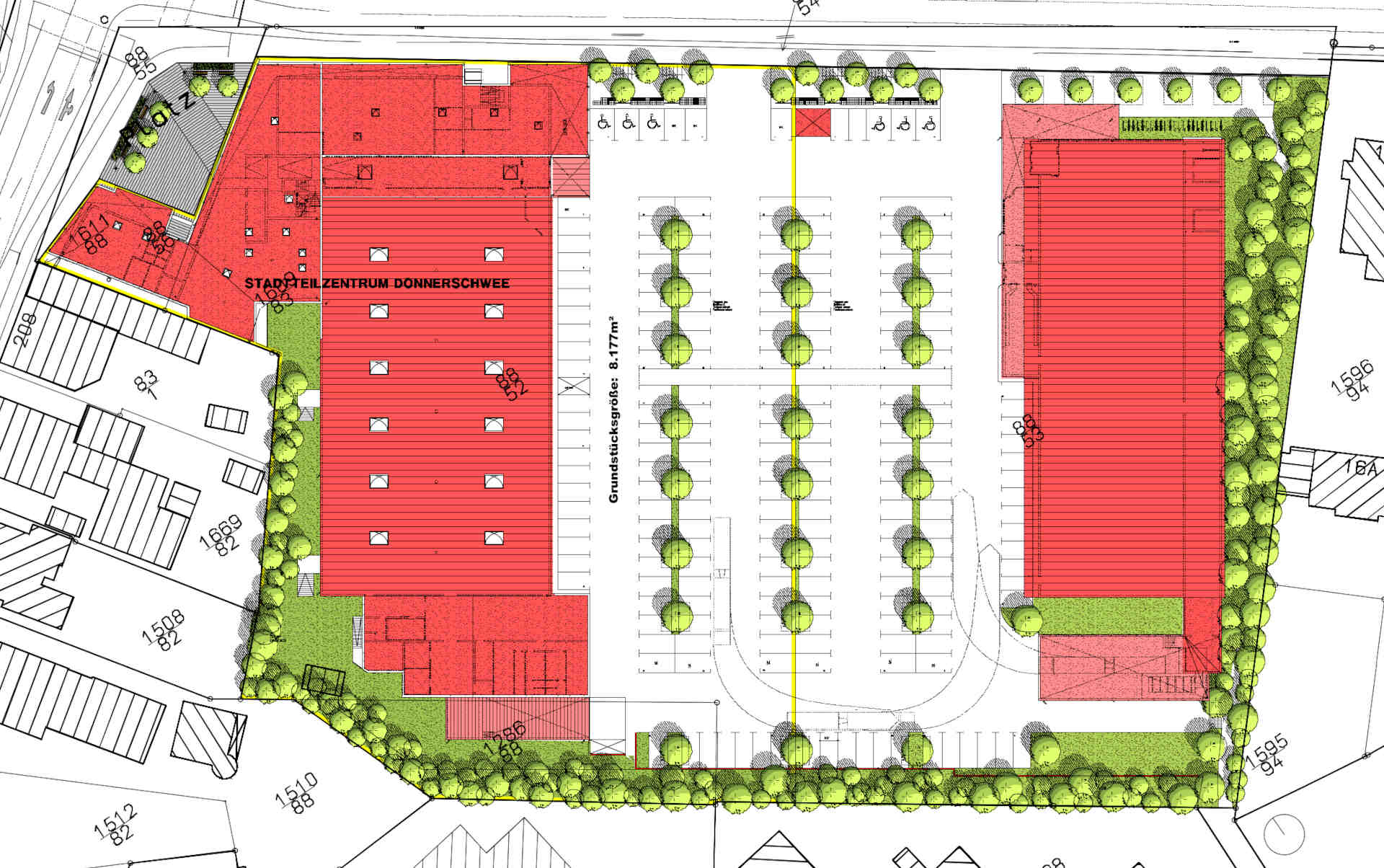 Neubau eines Stadtteilzentrum mit REWE-Vollsortimenter, Gastronomie, Apotheke, OLB-Filiale, Arztpraxen, Büroflächen , LIDL-Markt und 200 Stellplätzen